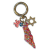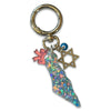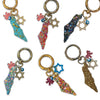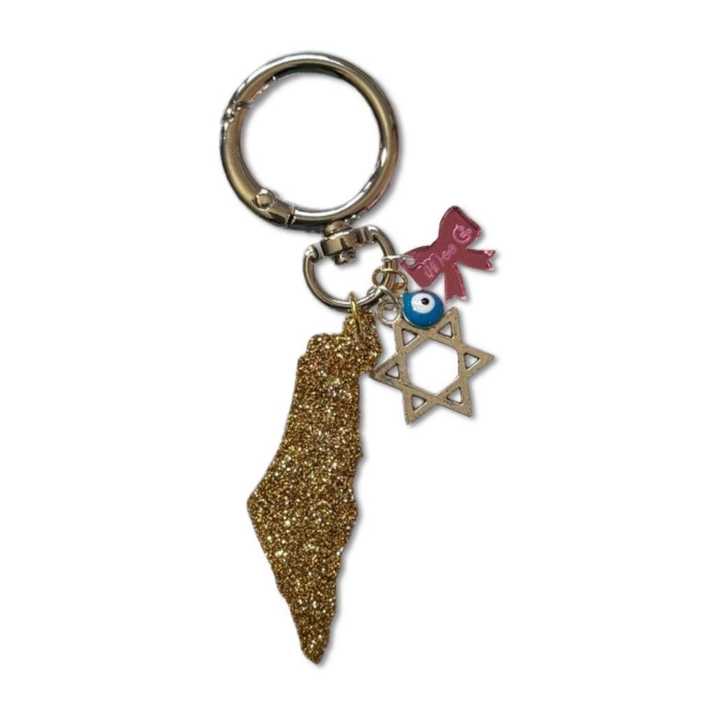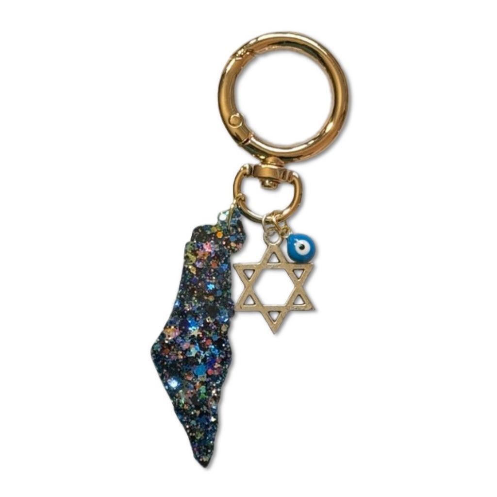 These map of Israel resin bag charms are made with different sparkling glitters and each has a Star of David (acrylic or metal) as well as a very small blue eye attached to it.