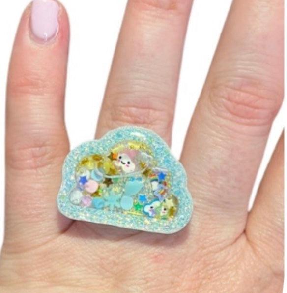 The different shapes measure between approximately 1-1.5 inches. The rings will be attached to an adjustable metal ring or a young child size plastic ring.