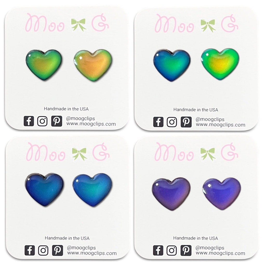 Our mood changing heart resin earrings are so cool! The hearts change colors with the warmth of the hand or the sun. They are hand painted and measure approximately 1/2." They are available on our stainless steel posts for those sensitive pierced ears or clear plastic clip ons for non pierced ears.