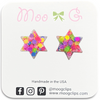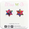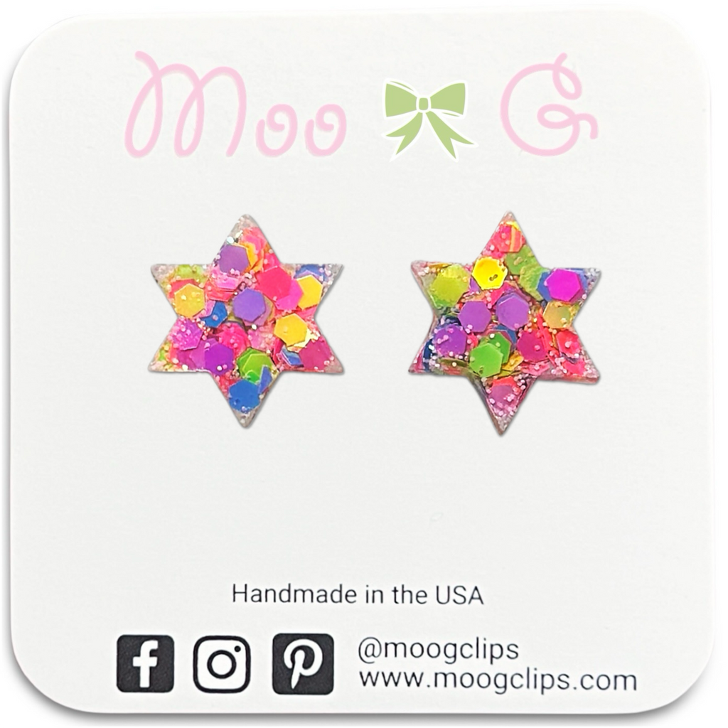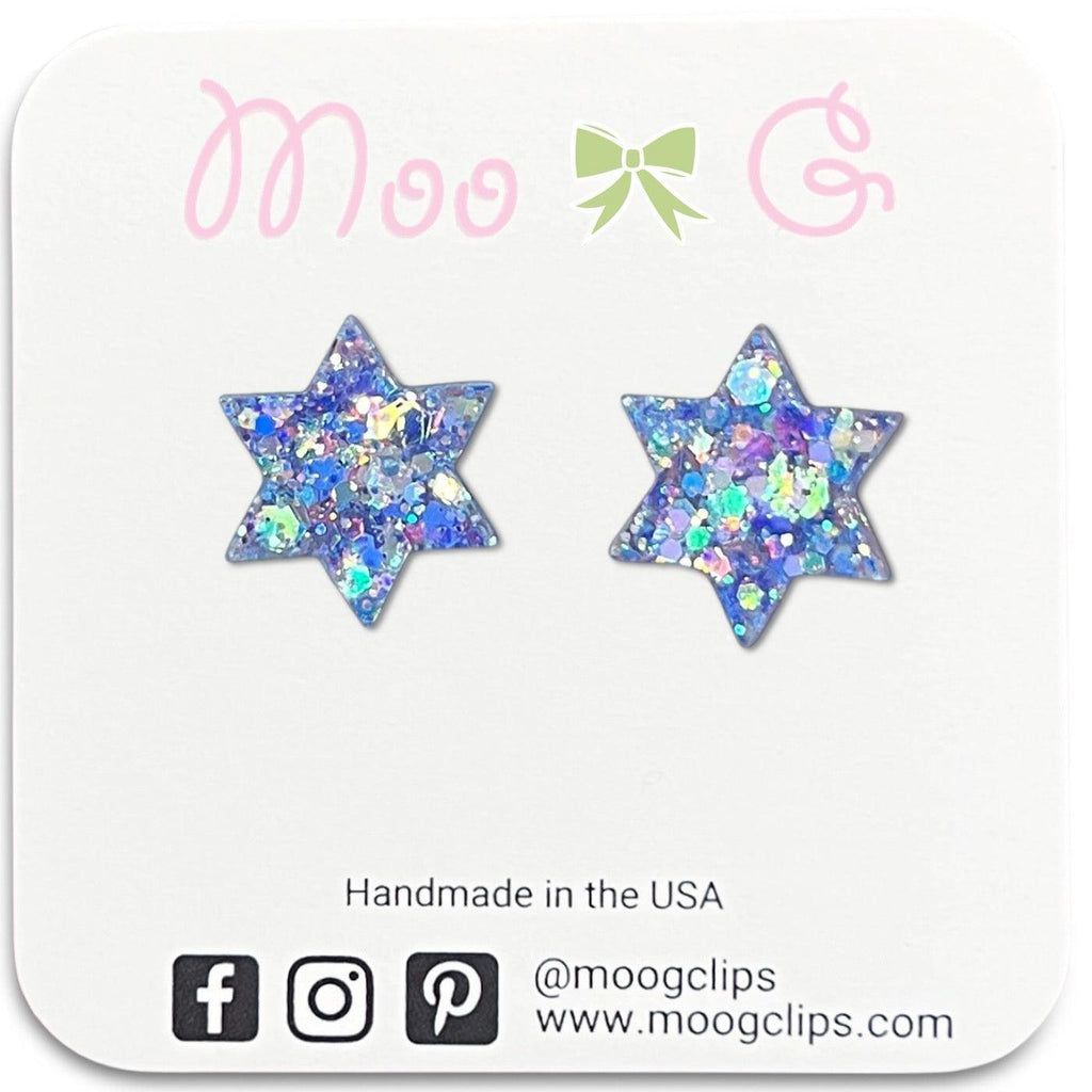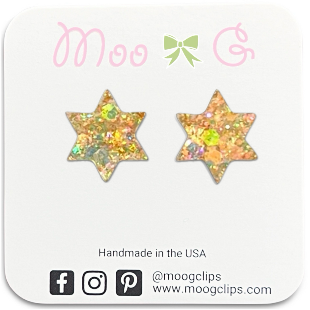 These stars are solid, so there are no holes/openings by each of the six points of the stars. They are approximately 5/8" (16mm) tall x 1/2” (14mm) wide and are available on our stainless steel posts for those sensitive pierced ears or clear plastic clip ons for non pierced ears.