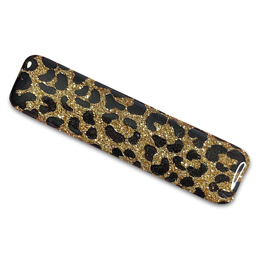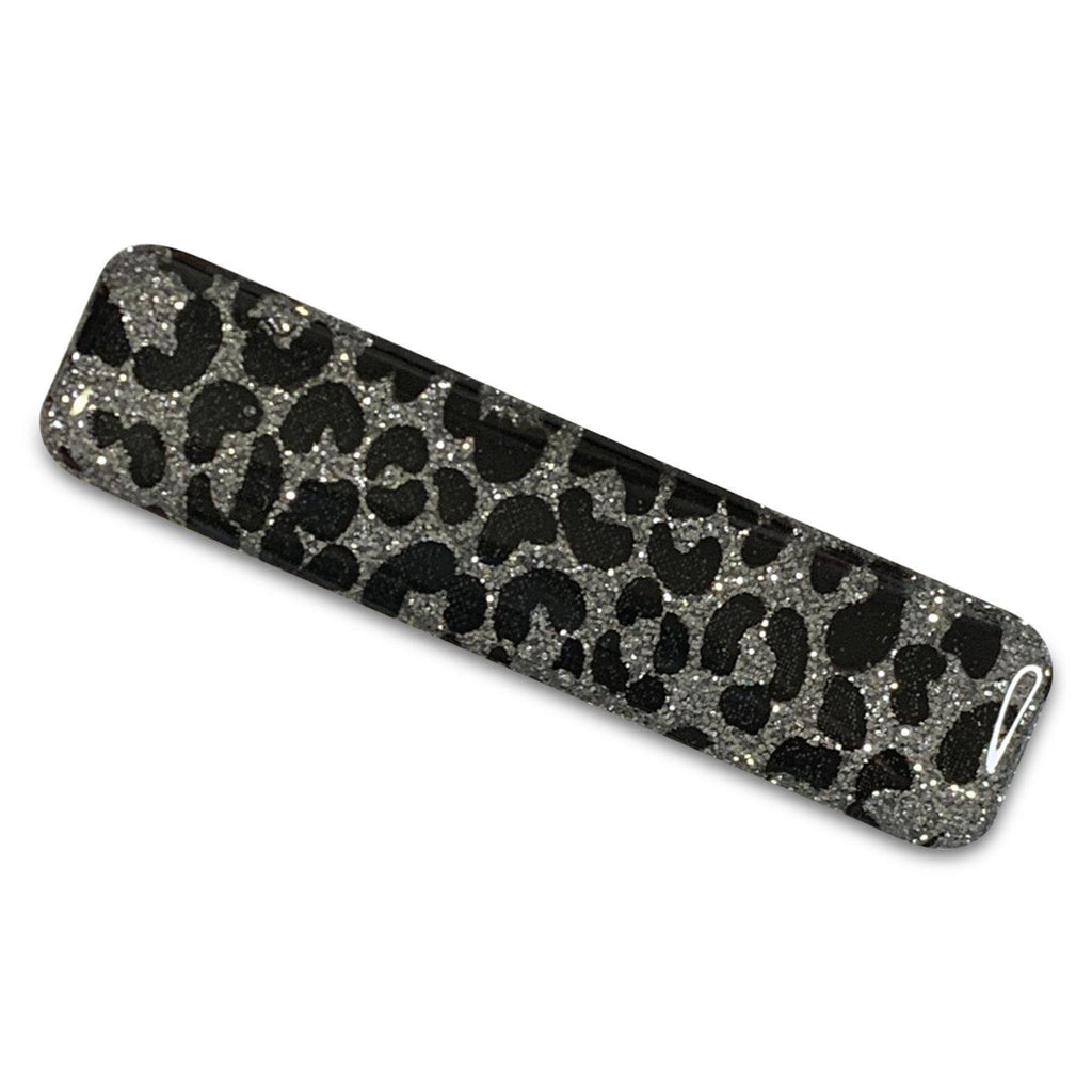 These no slip glitter resin bar hair clips are fabulously sparkly and they are great for all ages. The word "bar" refers to the shape of the clip. On top of the base color of these clips is a hand painted cheetah print.