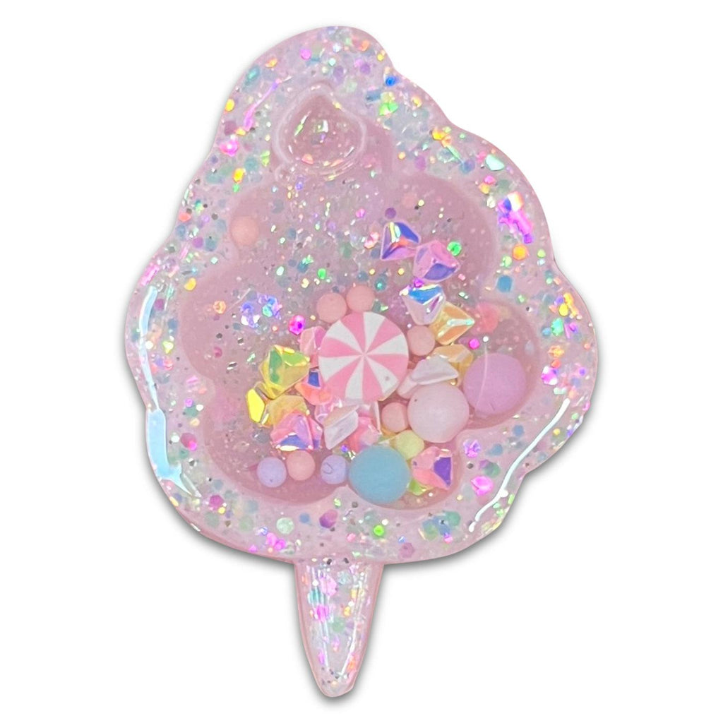 The cotton candy measures 1.25" x 1.75" and is available on a no slip hair clip, pin, or magnet, or hair clip. Make sure to turn your liquid shaker to see that there are some special details floating inside the shaker.