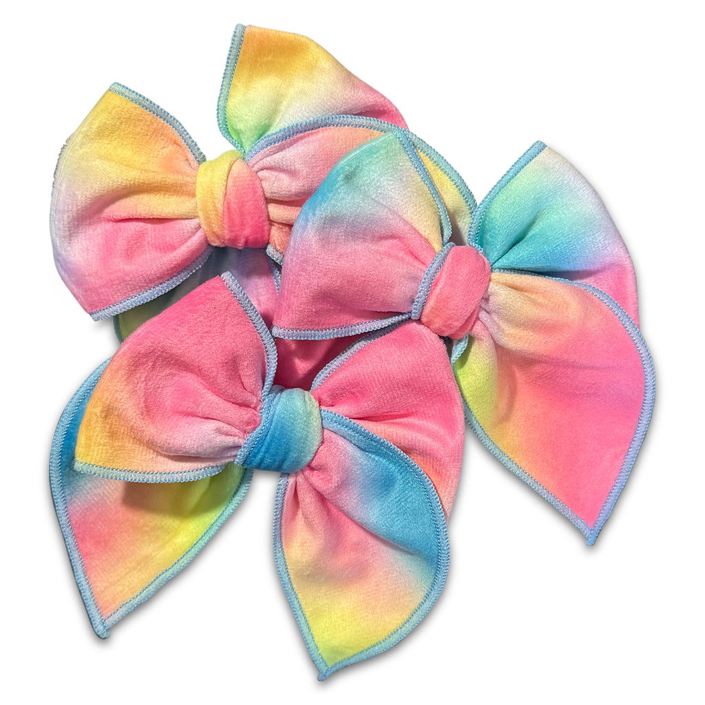These no slip Blue Stitched Edge Melted Rainbow Hair Bows are brand new, colorful, fun and so cheerful. Each bow measures approximately 4+,"  has a blue serged edge, and is attached to our lined alligator clip and coordinating no slip grip.