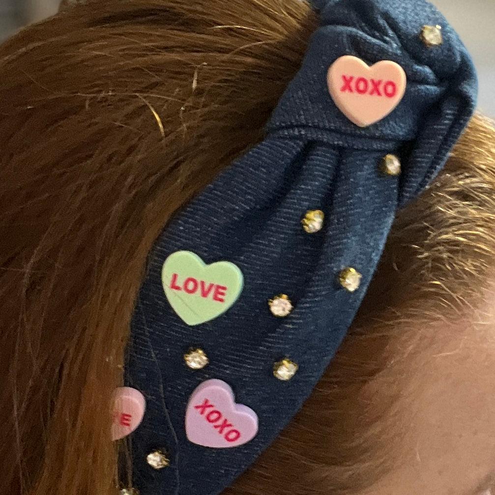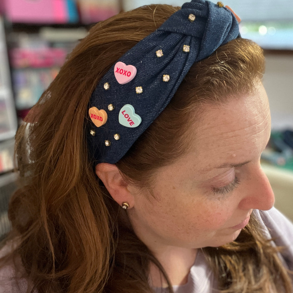 Conversation hearts denim knotted denim headbands are here!