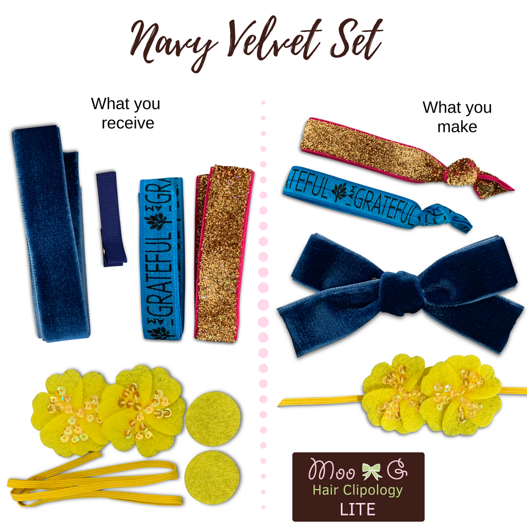This set is the Navy Velvet package. In this package, you will have the materials to make a medium light navy blue velvet no slip hair bow, a sequin felt floral skinny elastic headband (for mom or little ones), and two hair ties (I felt it apropos to have one that says GRATITUDE).