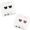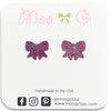 Our glitter bow resin earrings are so sweet and dainty. They measure approximately 1/2" and are available on our stainless steel posts for those sensitive pierced ears or clear plastic clip ons for non pierced ears.